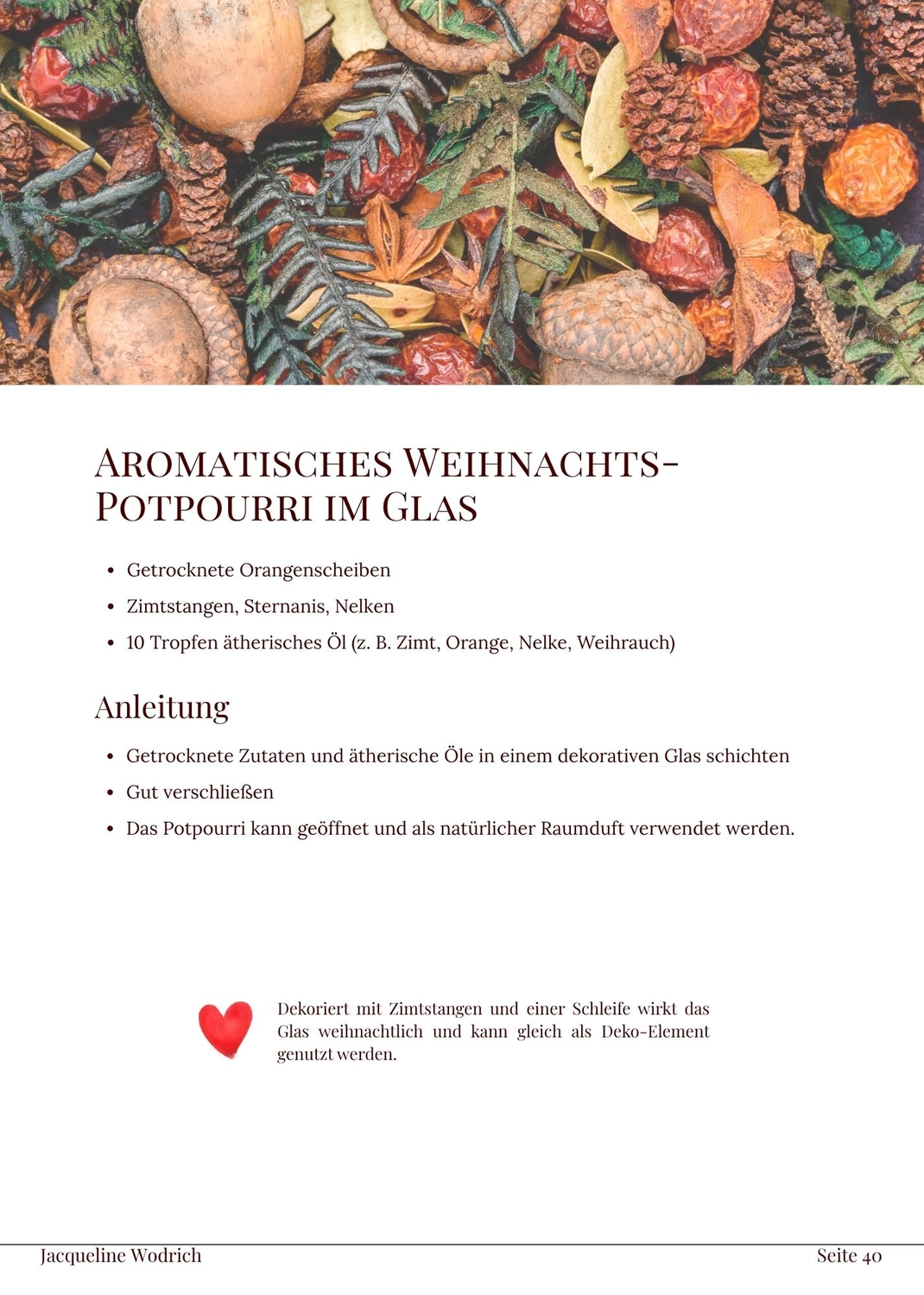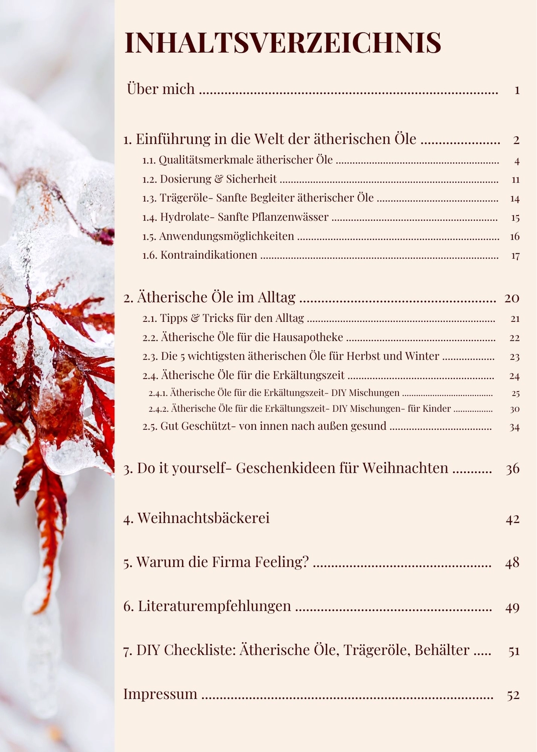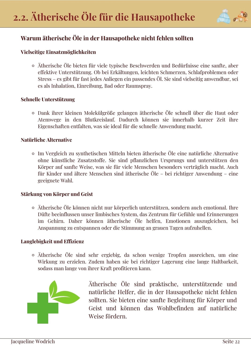 Ätherische Öle sind dabei wundervolle, natürliche Begleiter. In diesem Heft zeige ich Ihnen, welche Öle in Ihrer Hausapotheke nicht fehlen sollten – und wie Sie sie sicher und wirksam anwenden. Dazu finden Sie passende Rezepturen, DIY-Geschenkideen für die Adventszeit und aromatische Weihnachtsleckereien aus der Aromaküche.